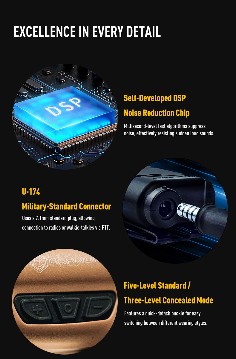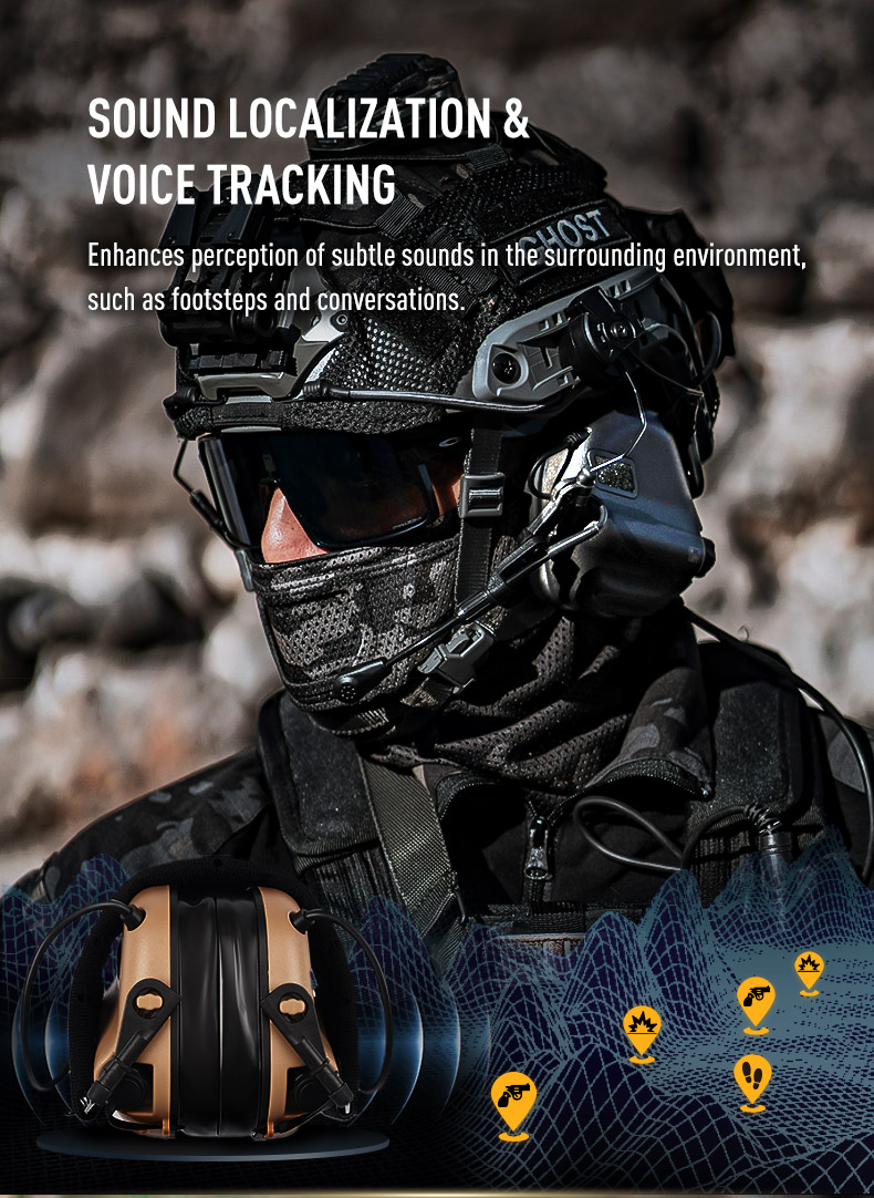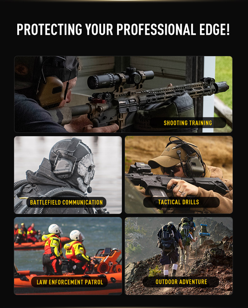 Gel Ear Cushions for Comfort: The headset is fitted with premium gel ear cushions that provide exceptional comfort during long hours of wear. The sweat-resistant and sound-leakage-proof design ensures a secure seal around the ears, maintaining effective noise isolation while reducing fatigue — ideal for extended use in both indoor ranges and outdoor missions.