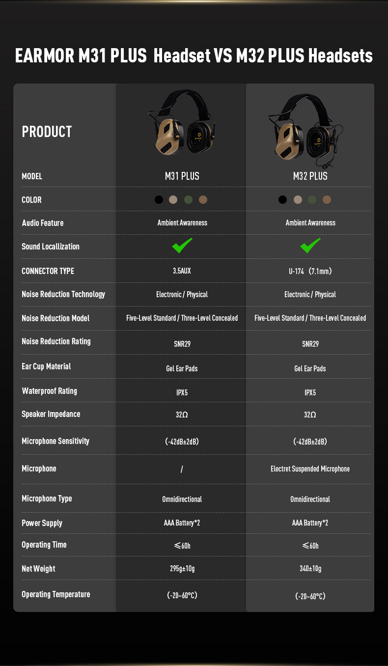 U-174 Military-Standard Cable: Equipped with a U-174 military-standard cable, the M32 PLUS ensures secure and reliable connectivity with NATO-standard PTT systems such as the EARMOR® M51/52. This robust interface guarantees stable signal transmission and broad compatibility across tactical communication platforms, making it ideal for professional use in military, law enforcement, and training environments.