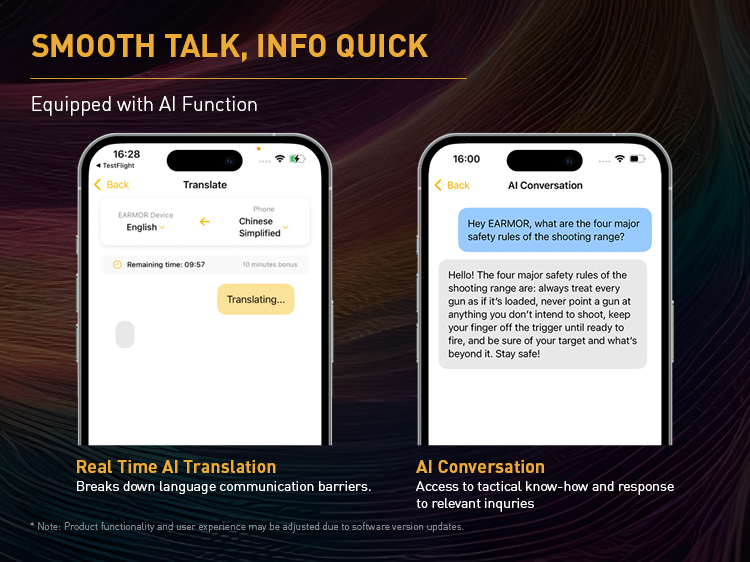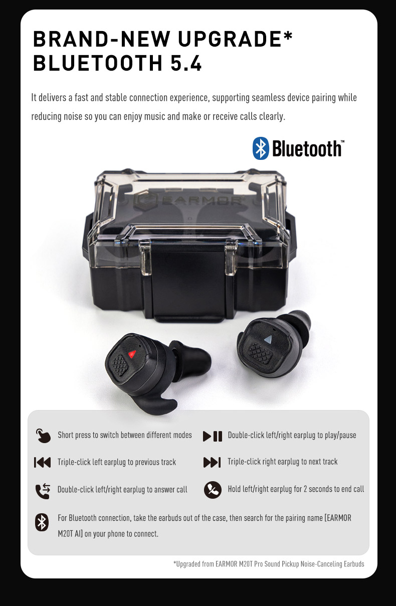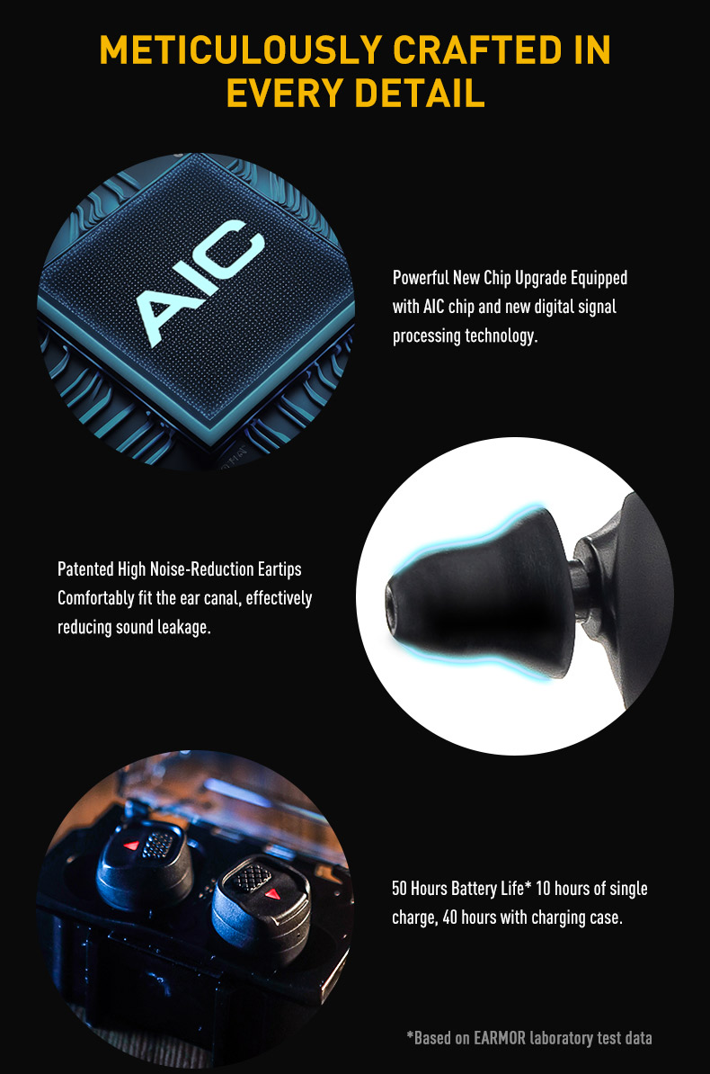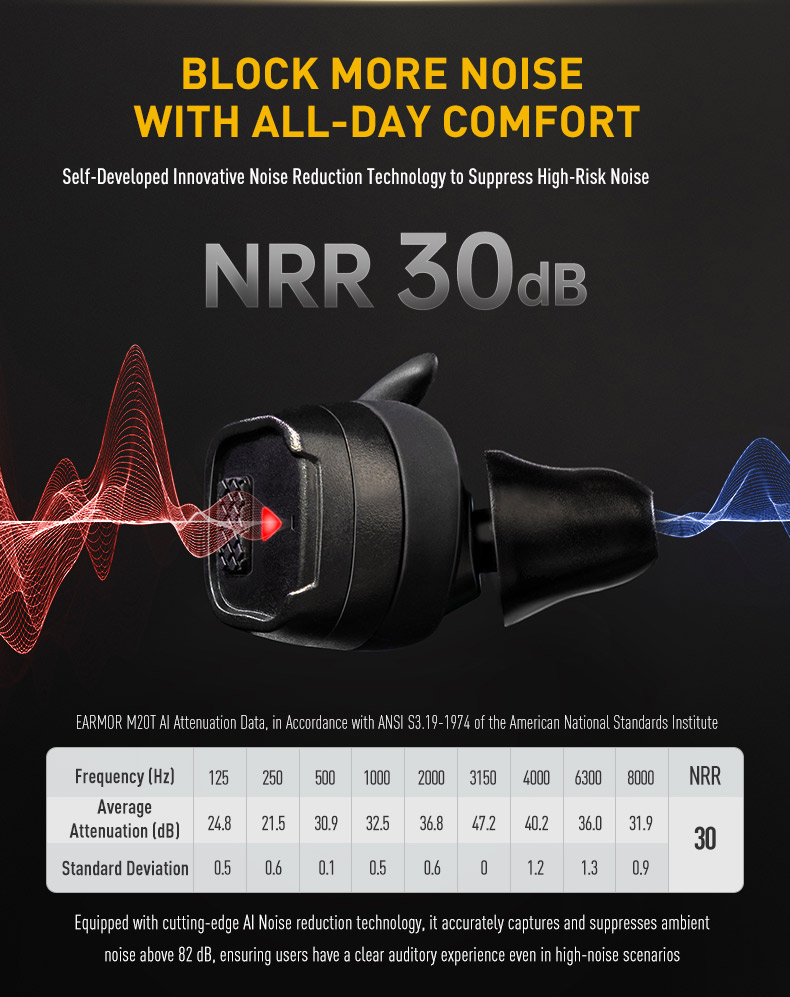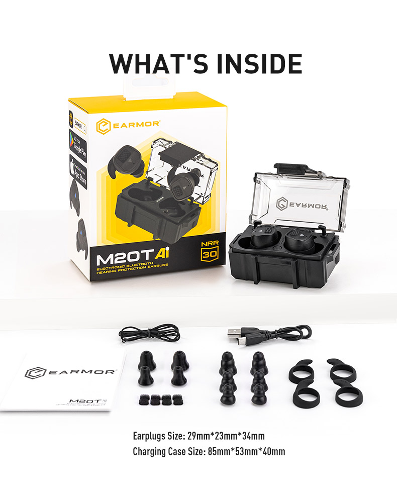 EARMOR M20T AI shooting hearing protection earplugs combine smart app control, AI-powered translation and conversation, adjustable listening modes, ergonomic self-developed foam eartips, and a portable charging case for a personalized and comfortable hearing protection experience.