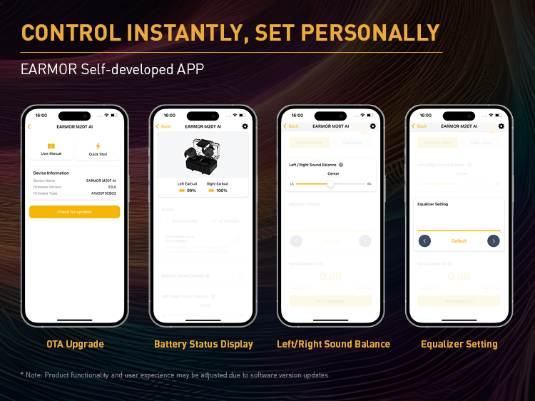 Smart APP Control:The EARMOR Self-developed App enables over-the-air (OTA) updates for the M20T AI, allowing remote software and firmware upgrades to continuously improve functionality. You can also monitor the battery status of your earbuds and customize EQ settings to suit your personal audio preferences.